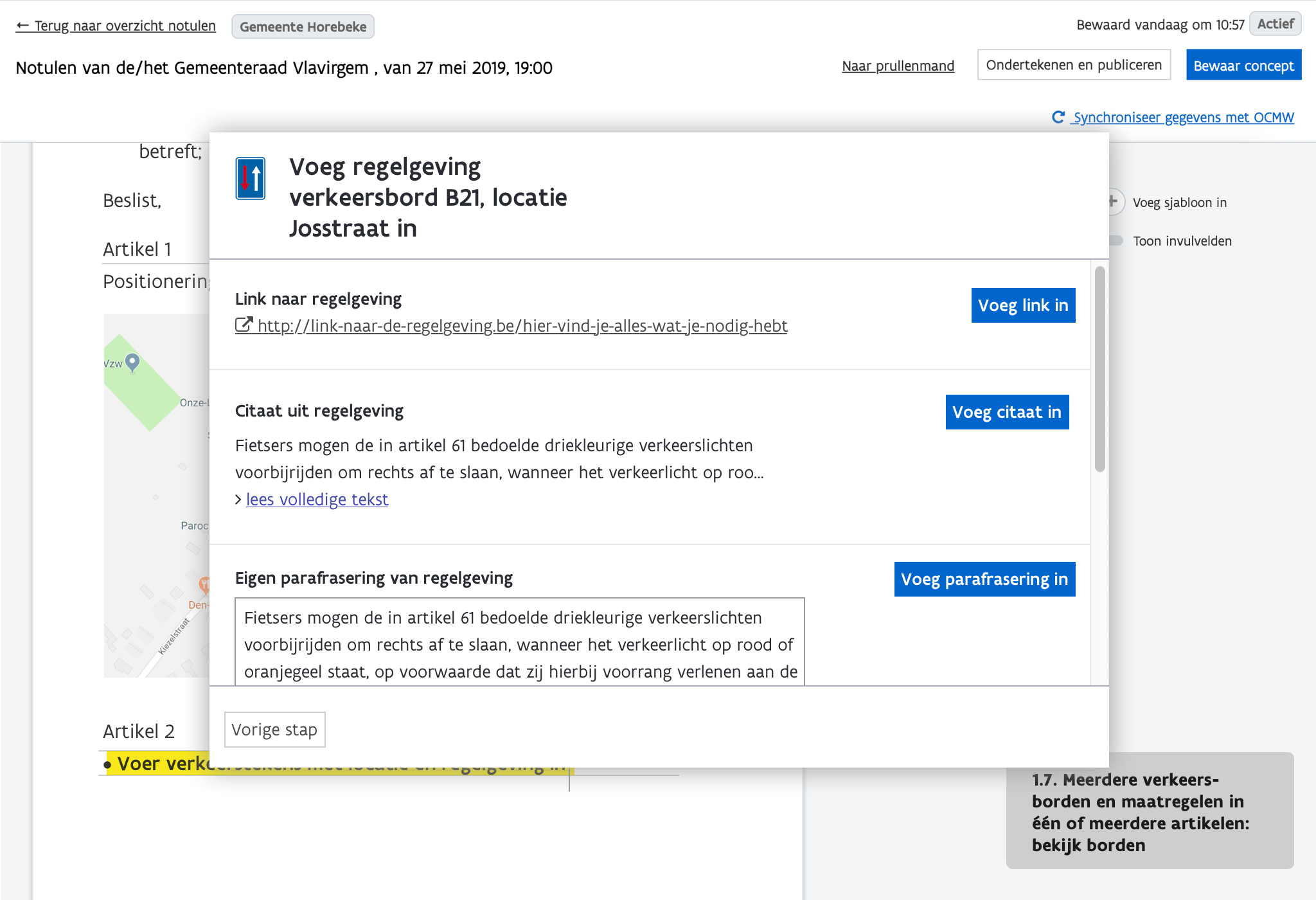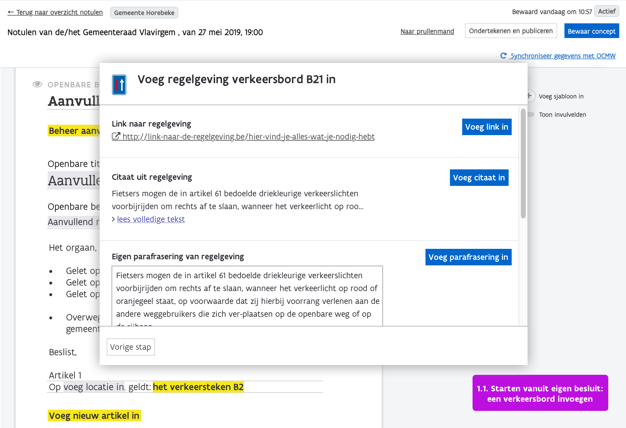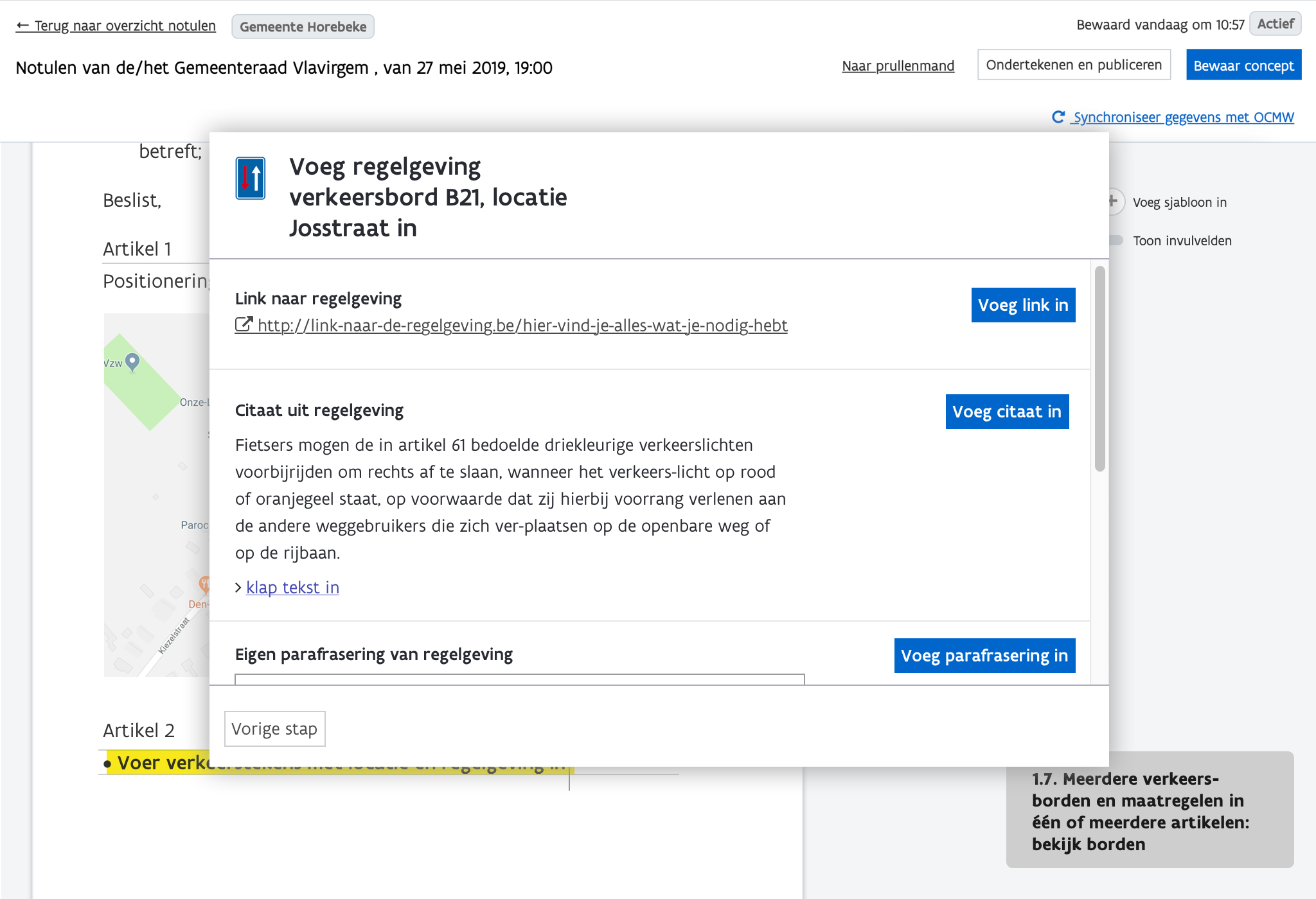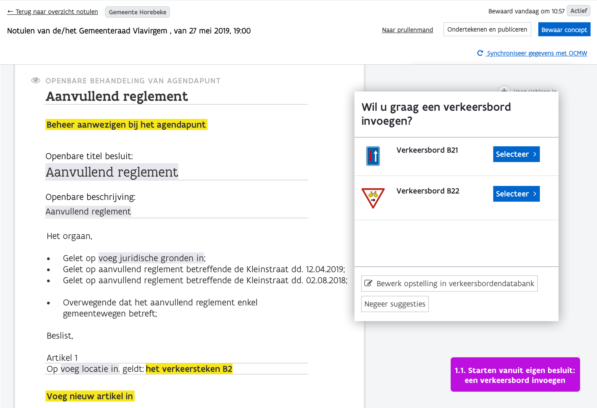 Scenario: Gelinkt Notuleren pikt Algemeen wegenreglement op, opslaan als ontwerpbesluit