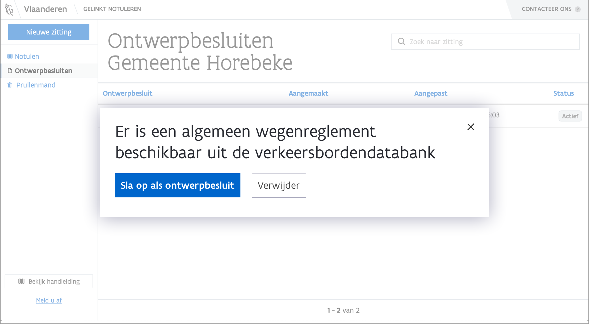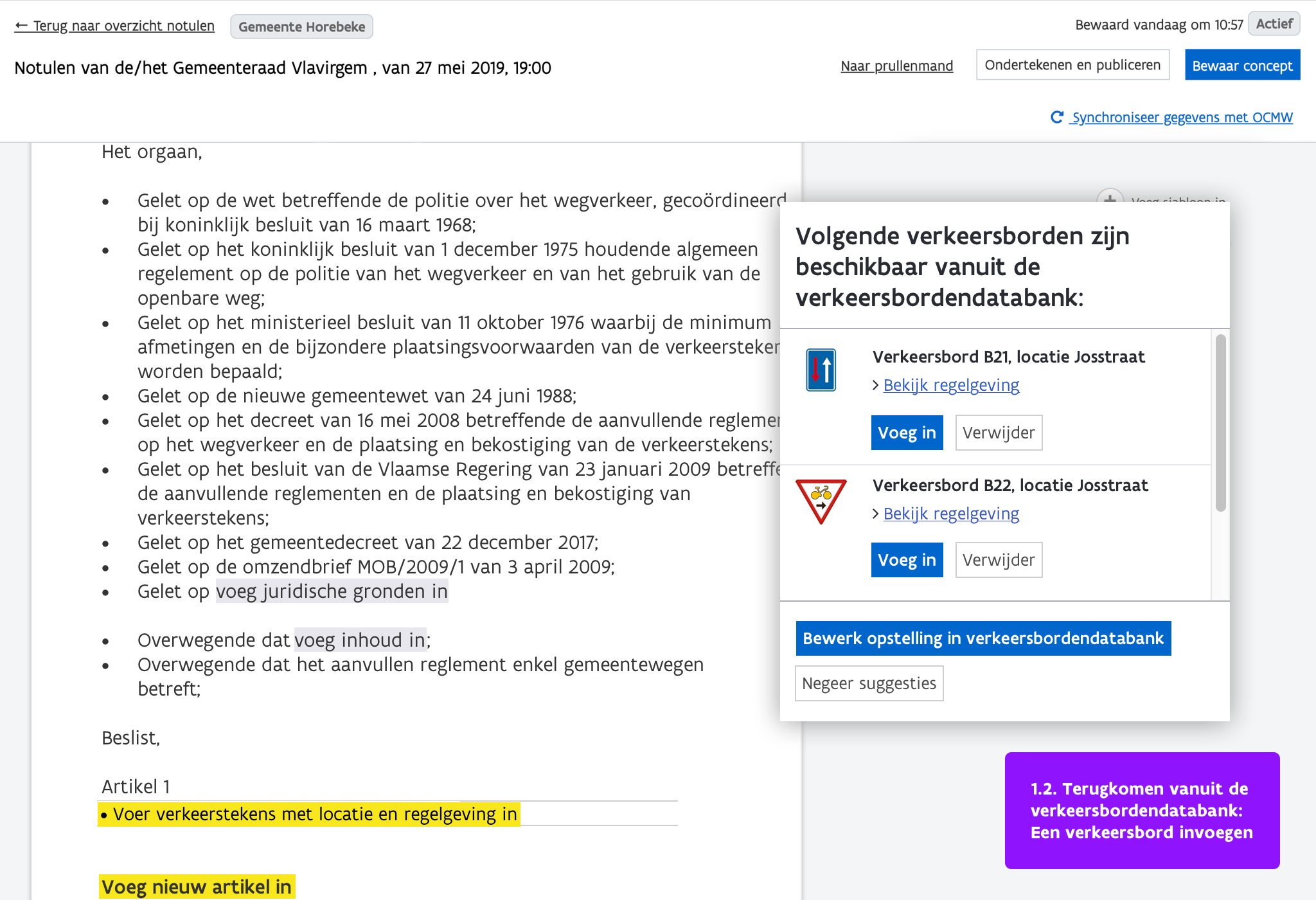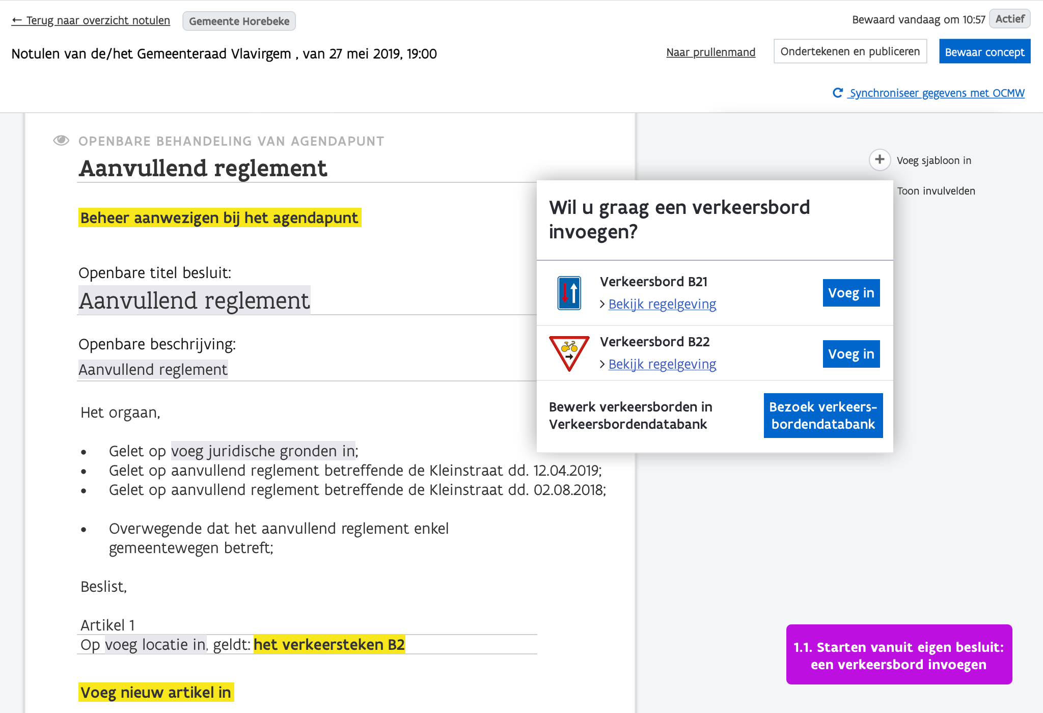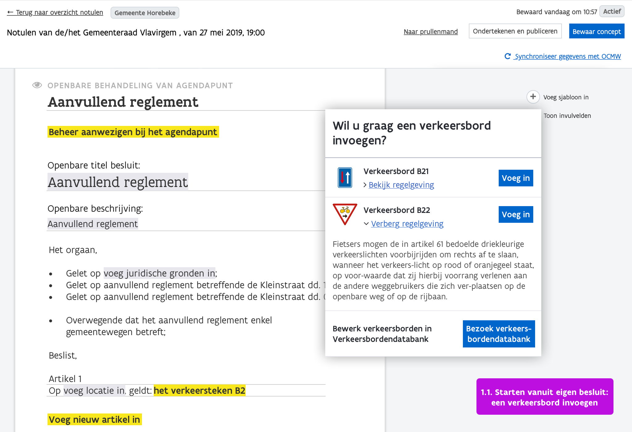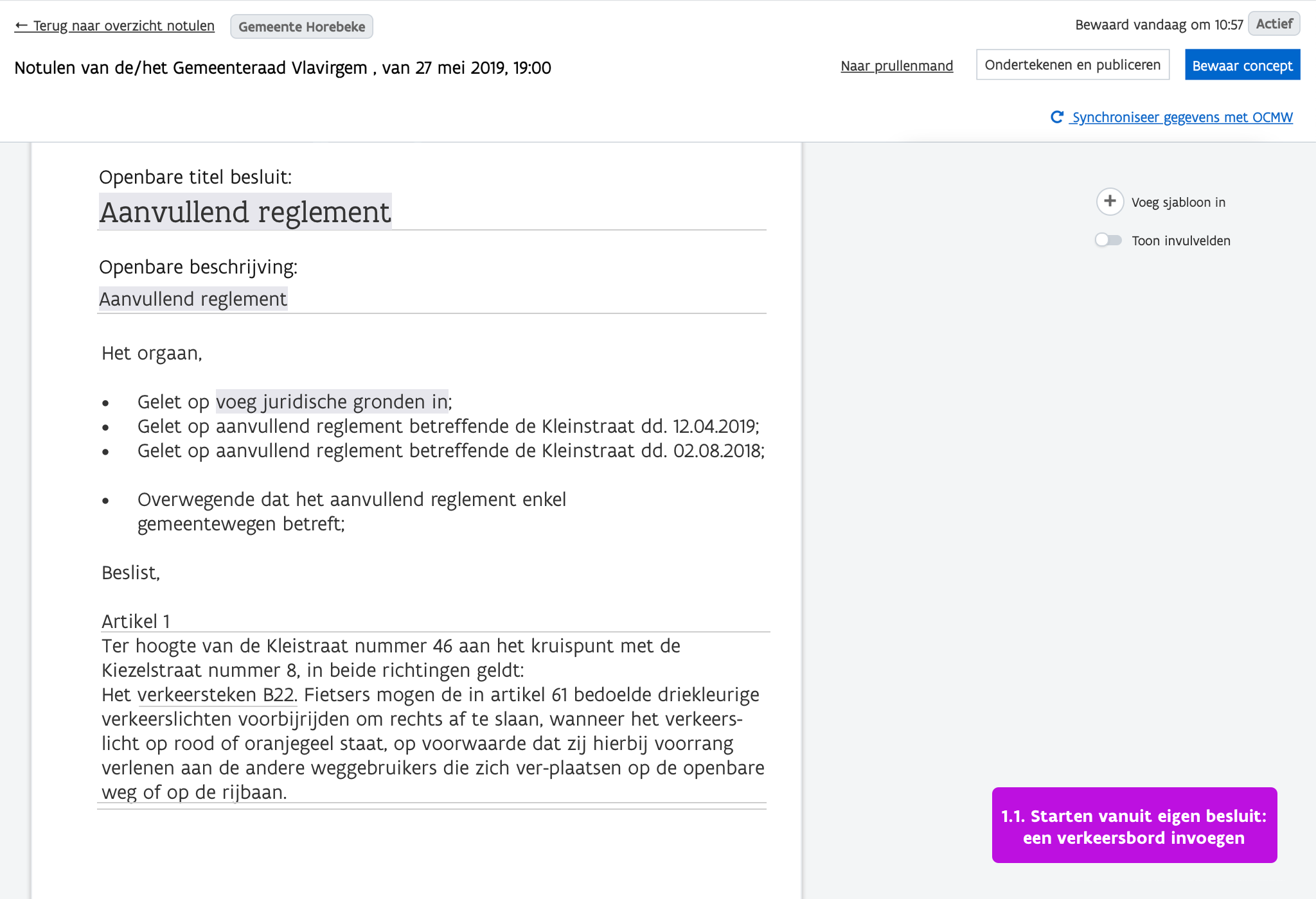 Scenario: Gelinkt Notuleren pikt Algemeen wegenreglement op, opslaan als ontwerpbesluit