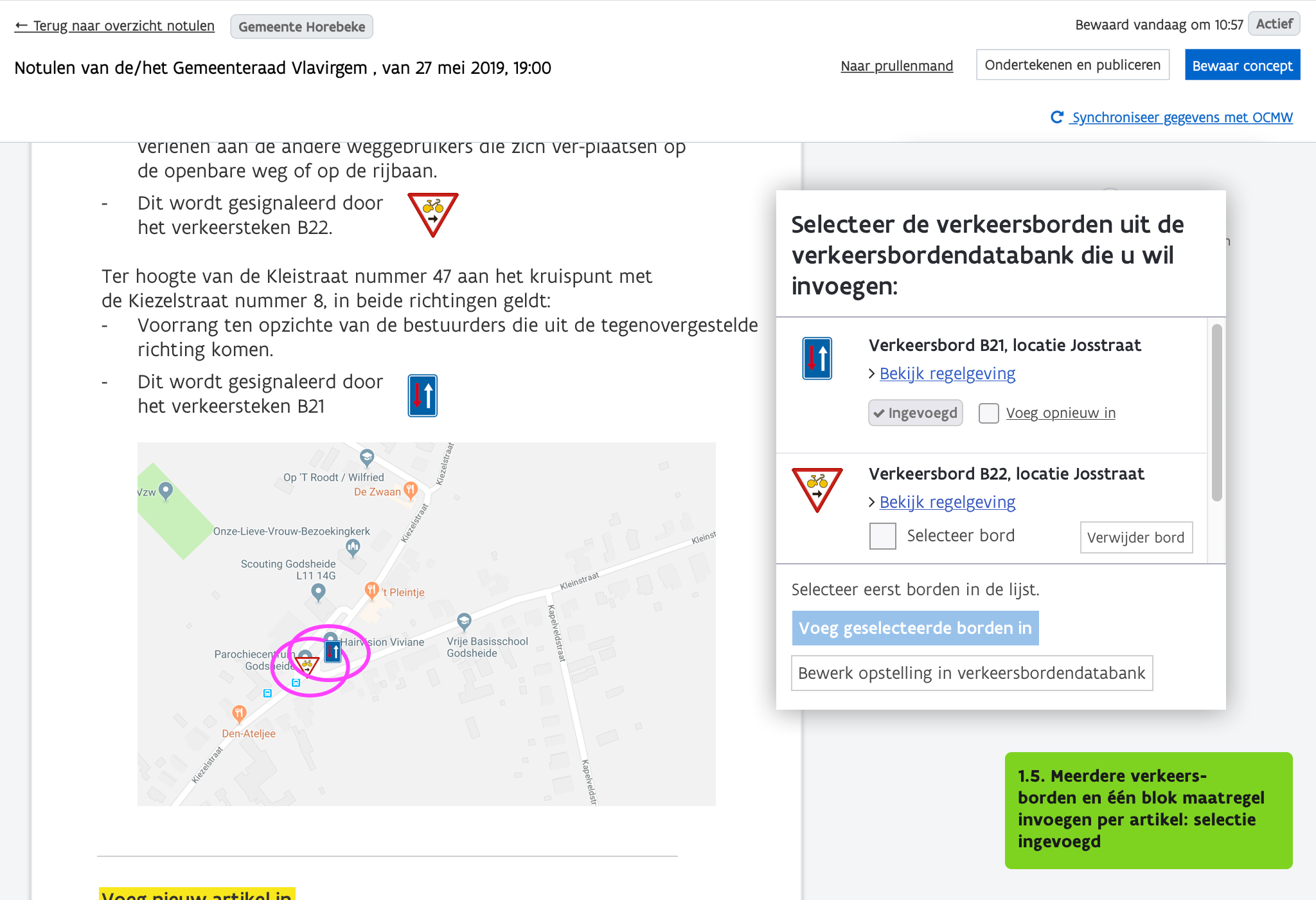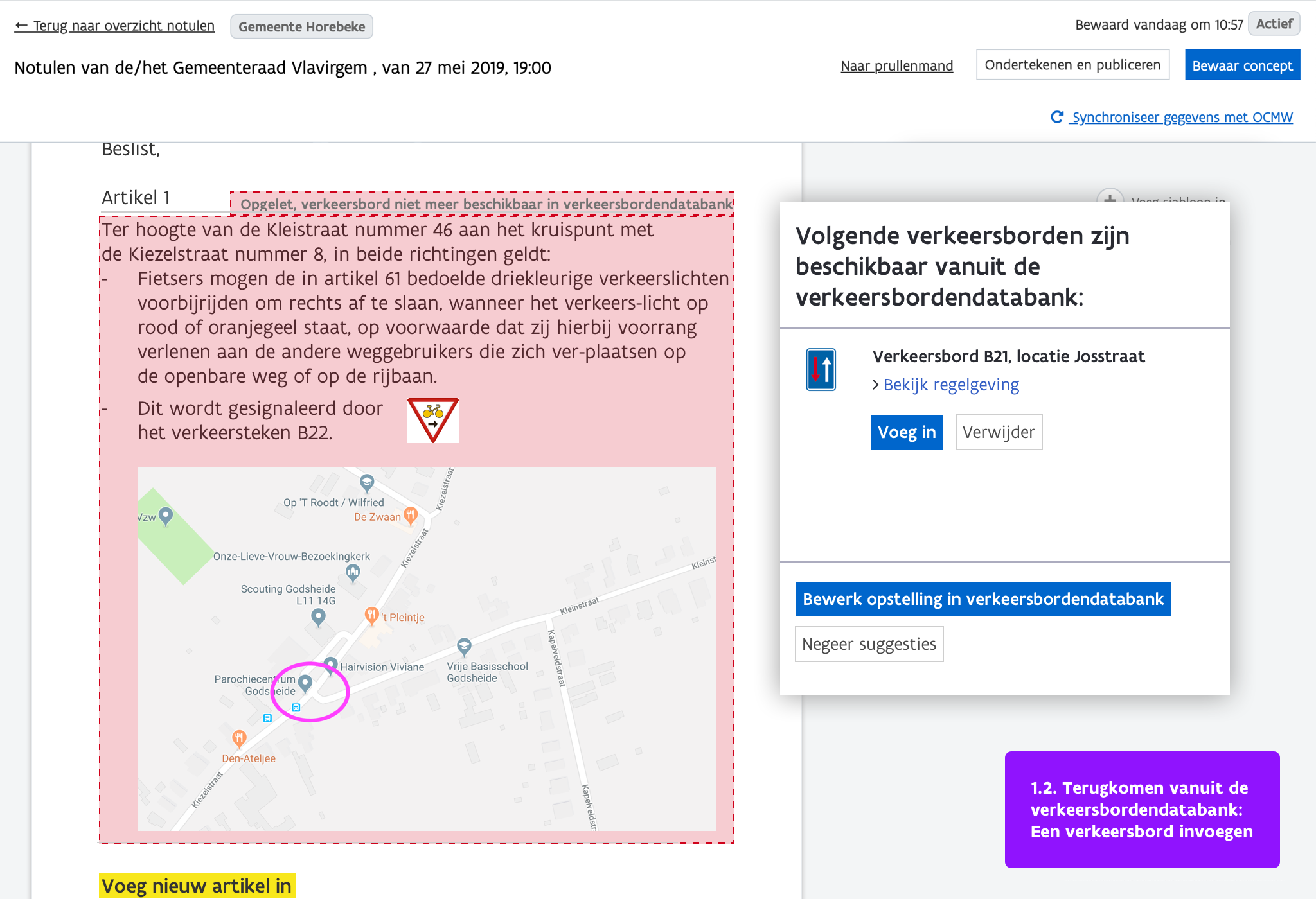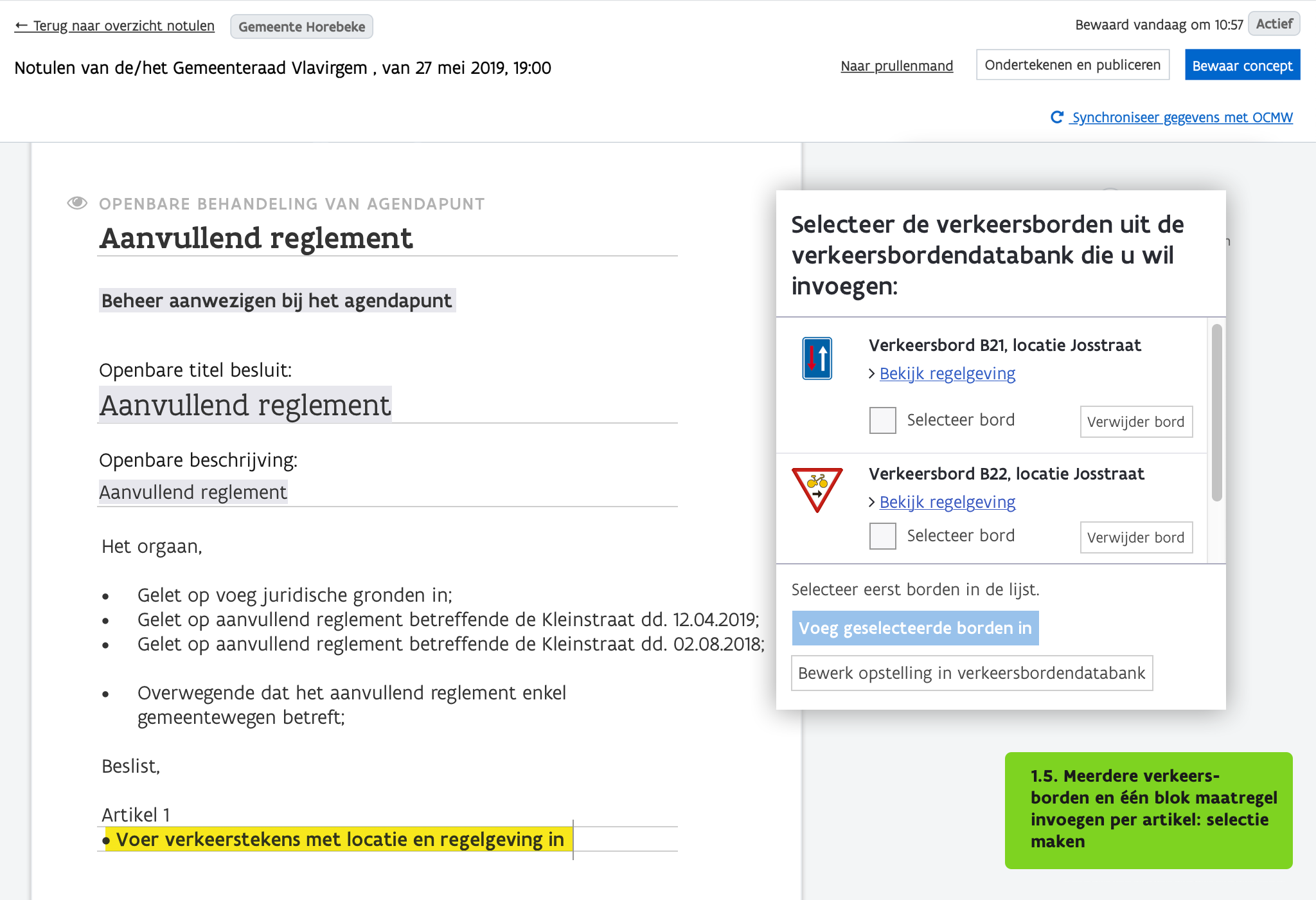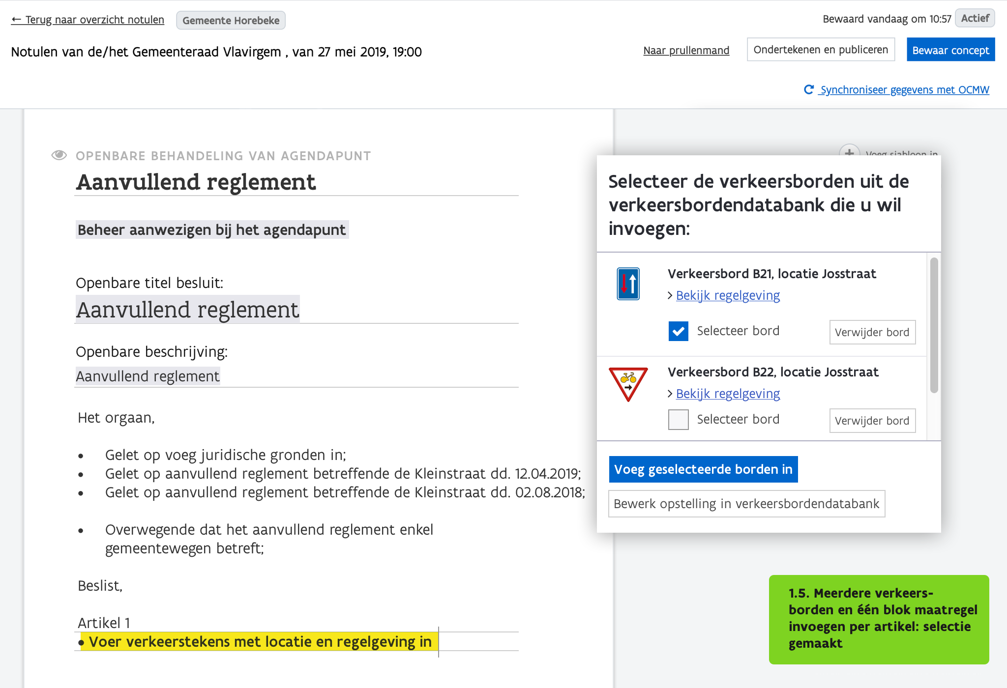 Scenario: Gelinkt Notuleren pikt Algemeen wegenreglement op, opslaan als ontwerpbesluit